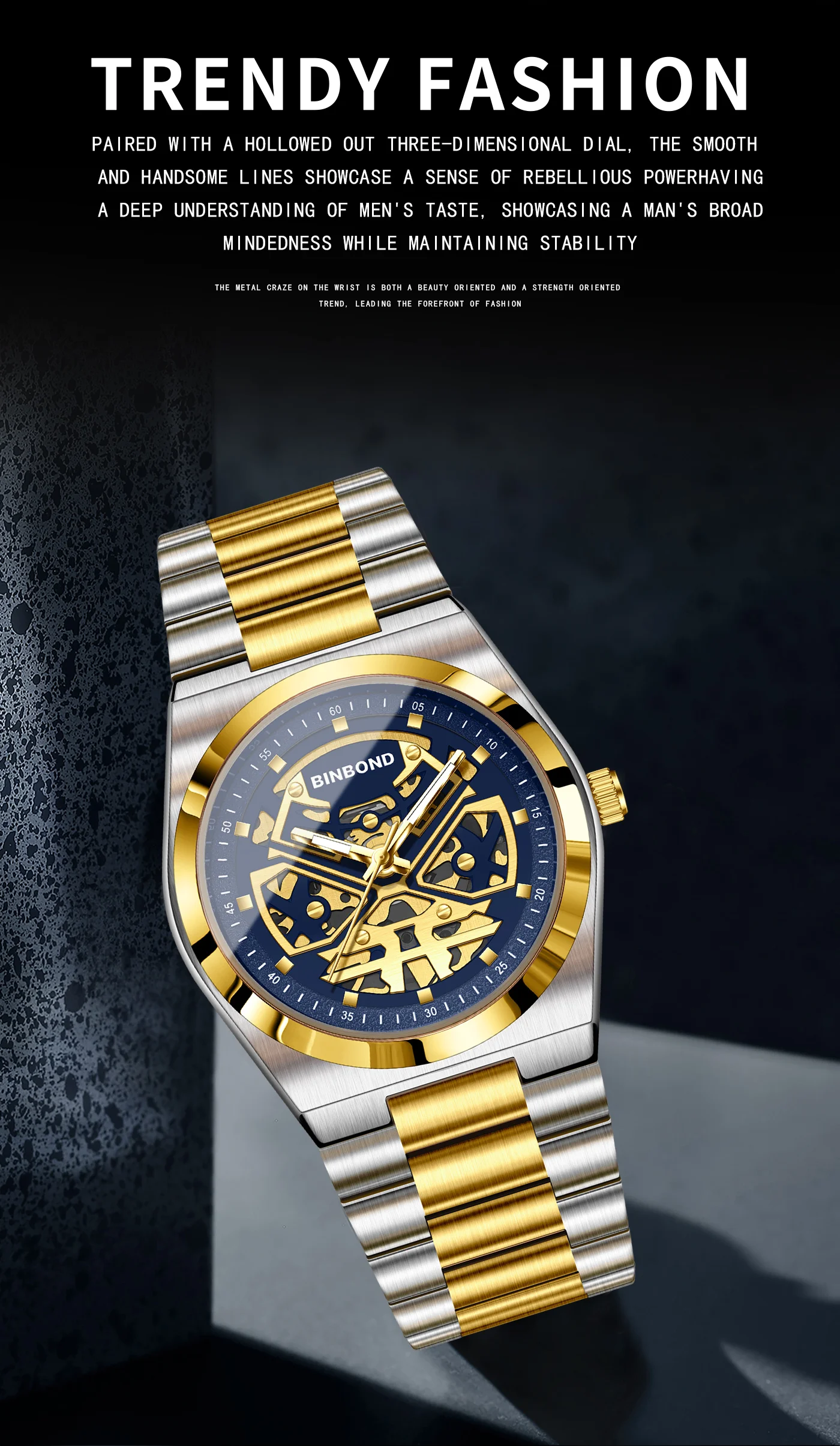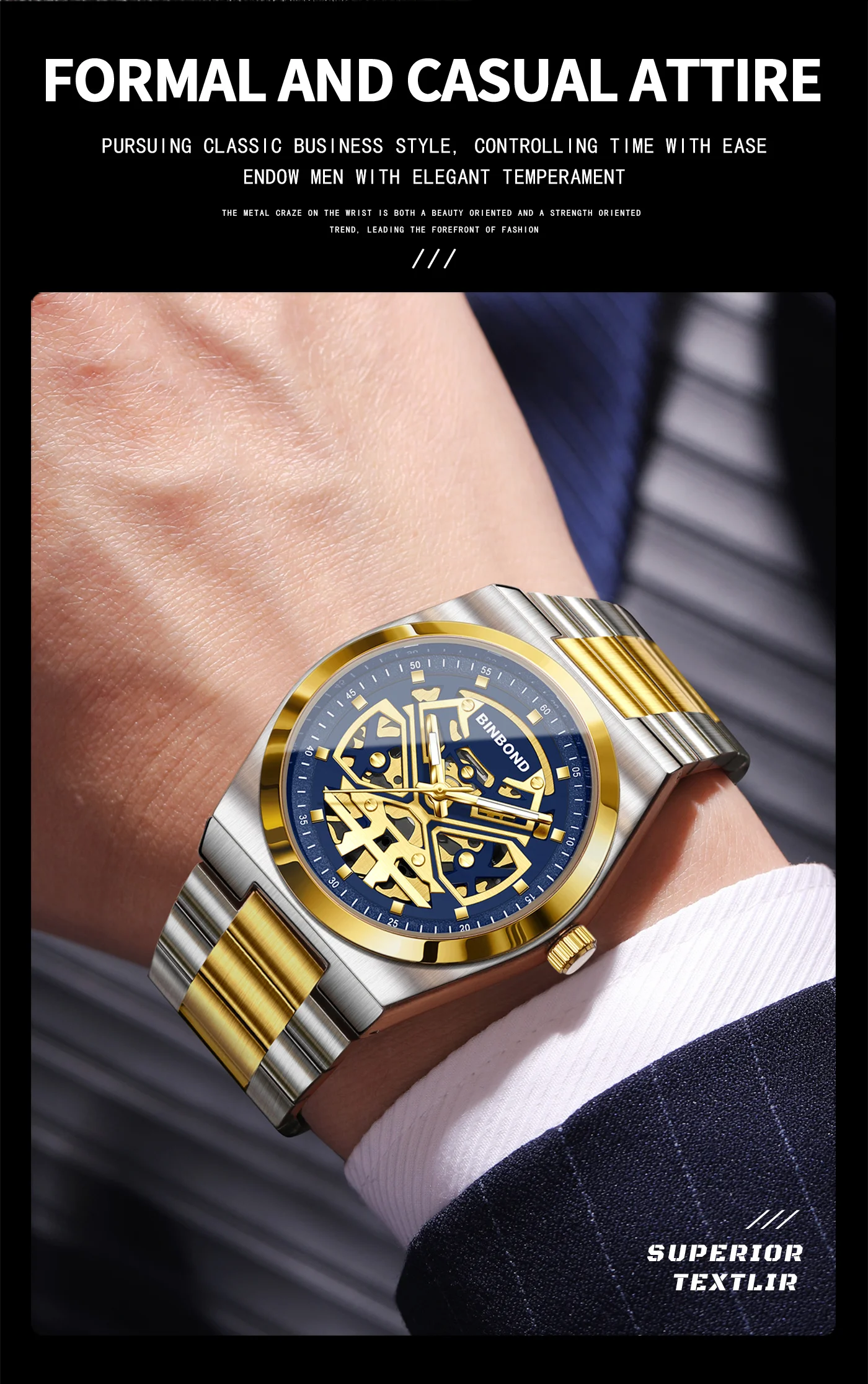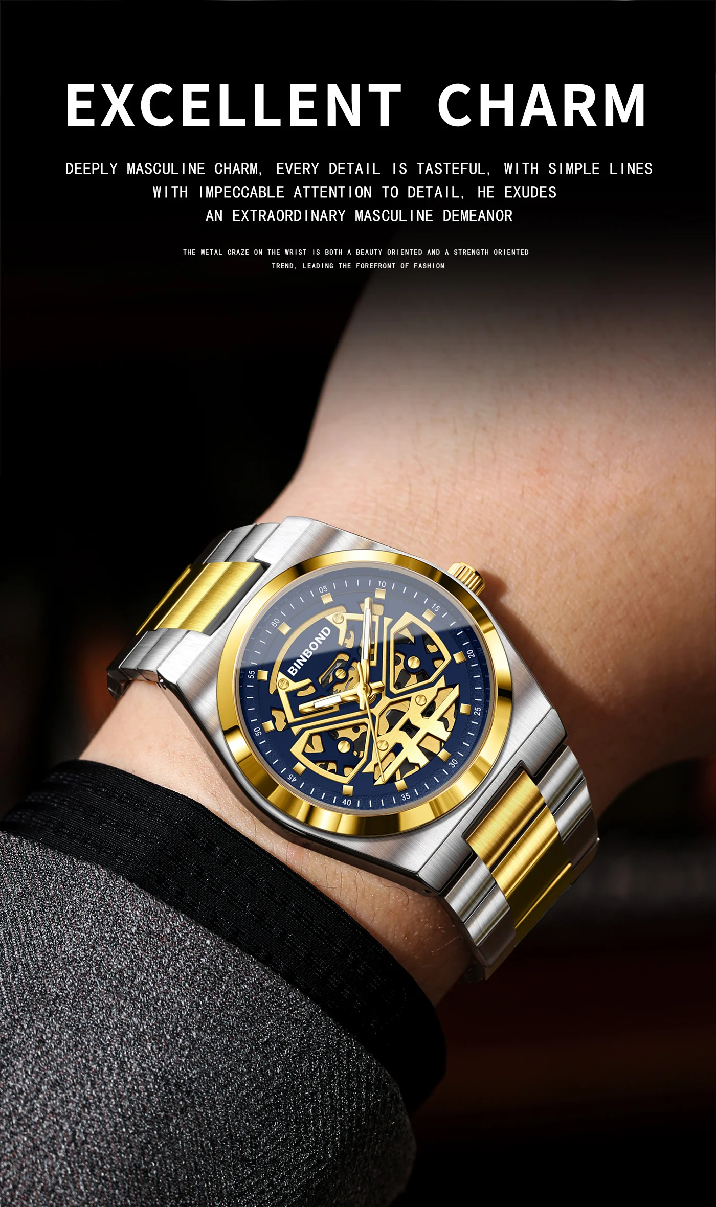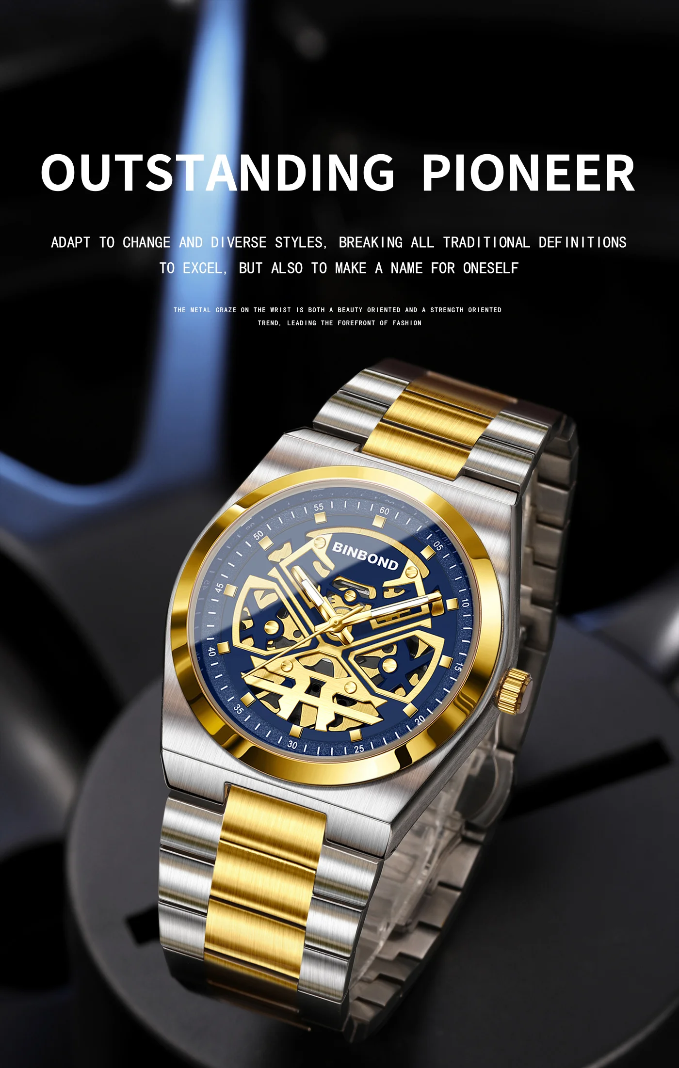 BINBOND brand skeleton fashion watch men’s luxury sports watch high-end luxury waterproof night light men’s quartz watch