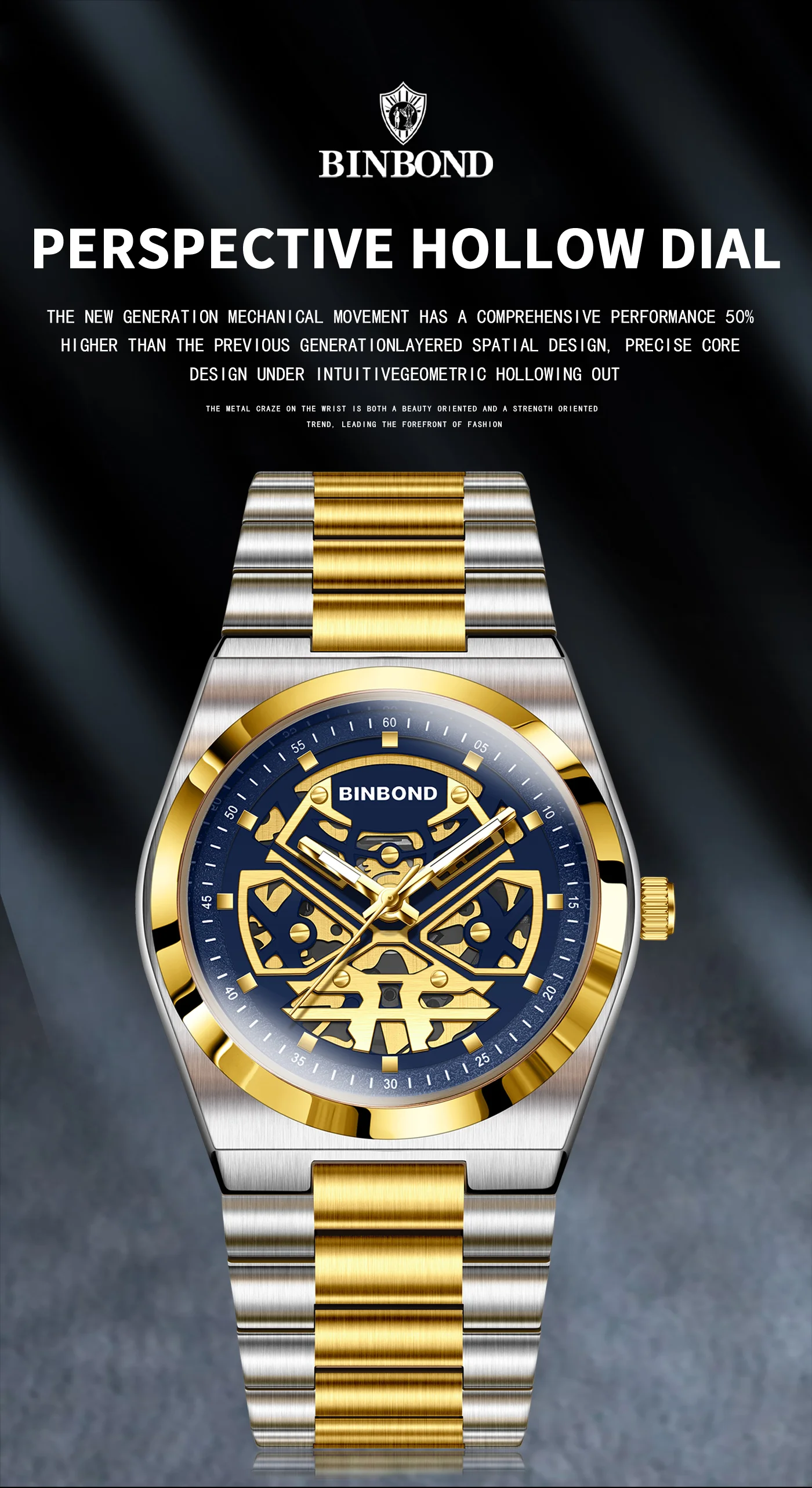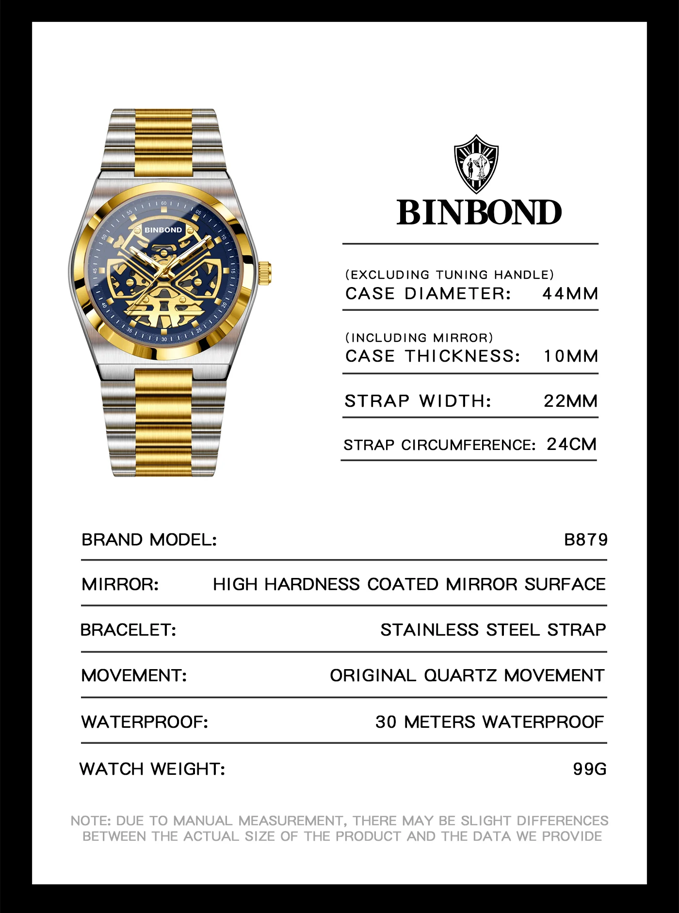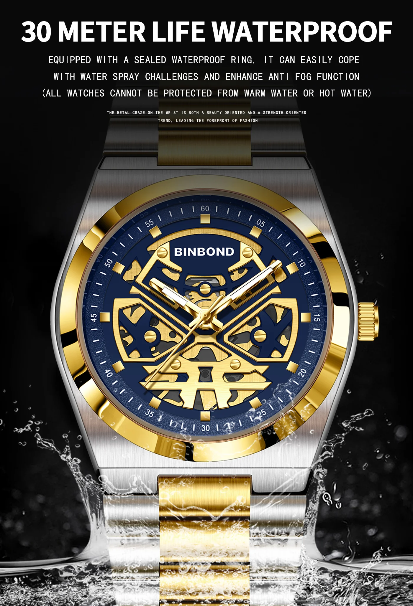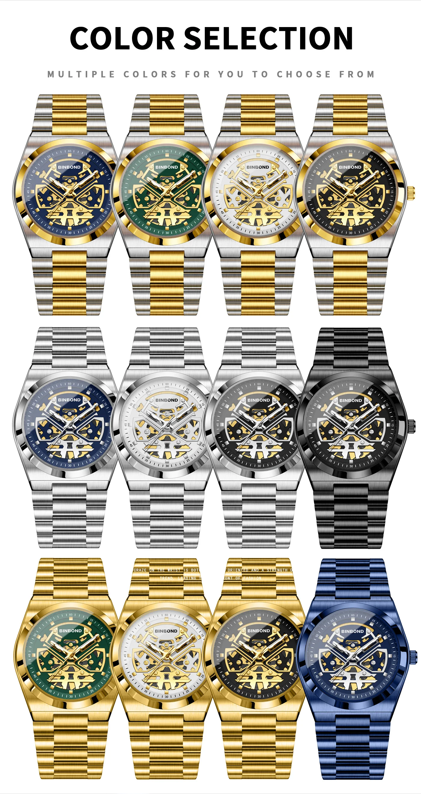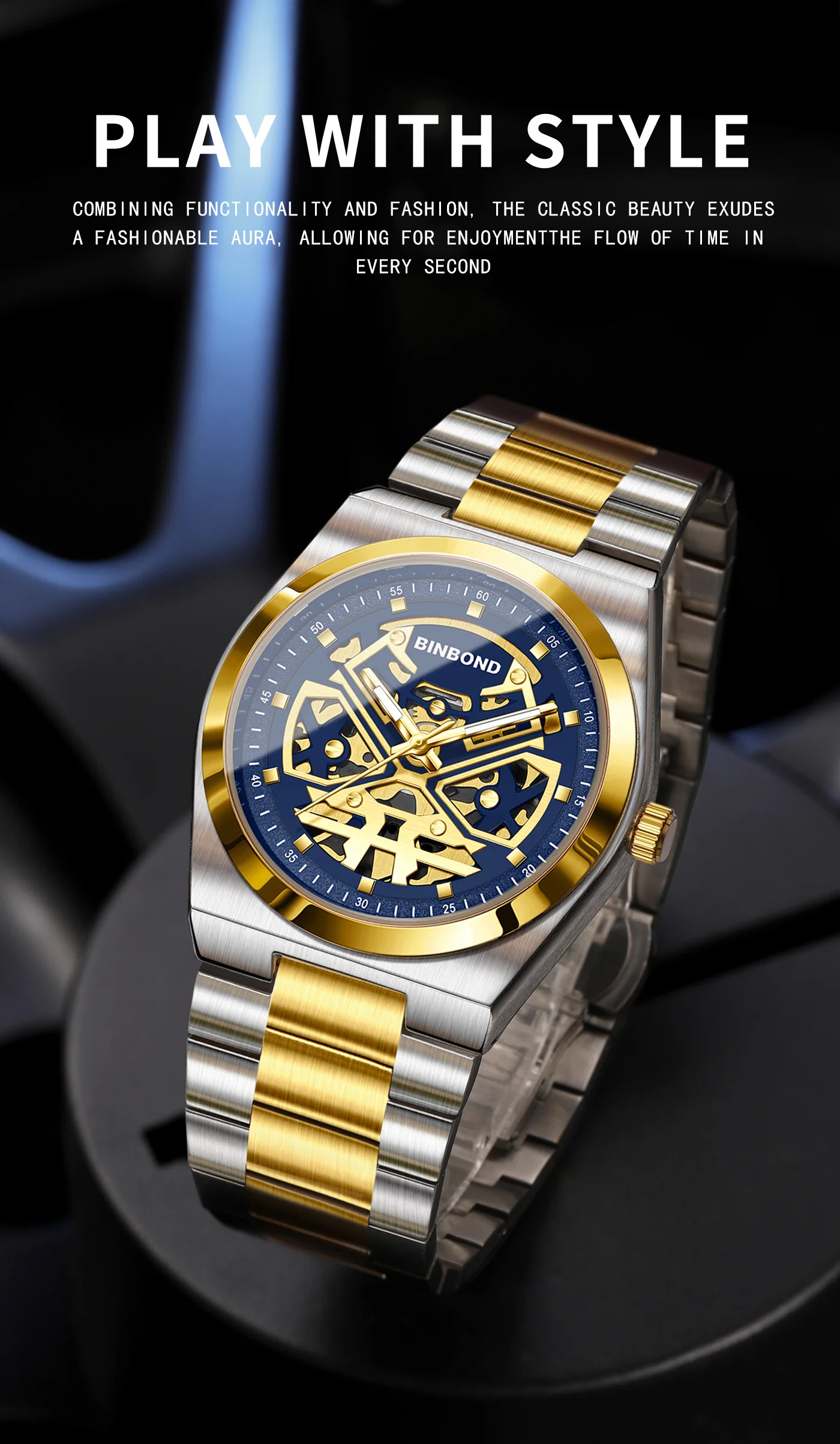 BINBOND brand skeleton fashion watch men’s luxury sports watch high-end luxury waterproof night light men’s quartz watch