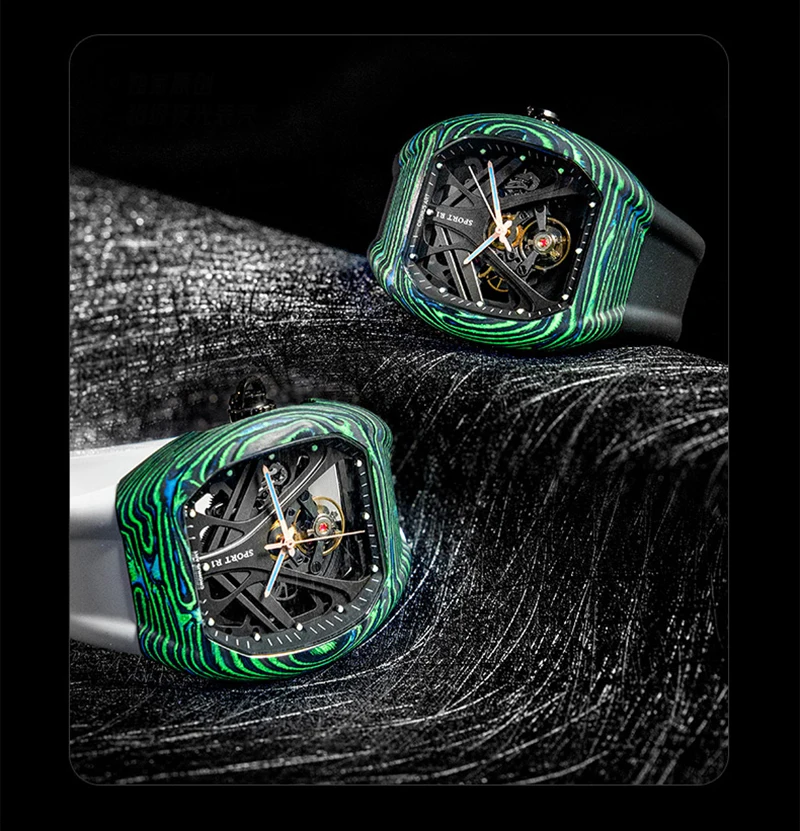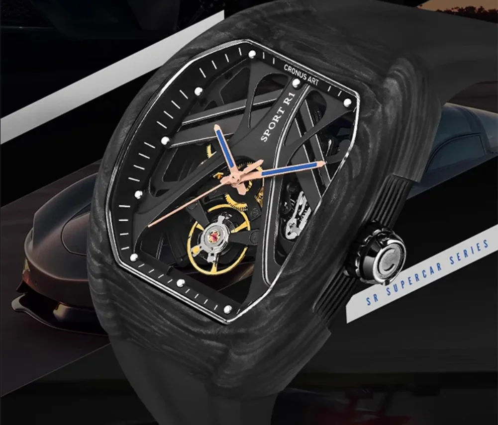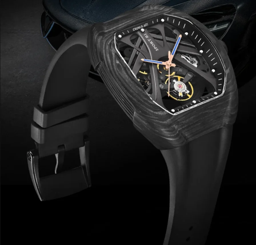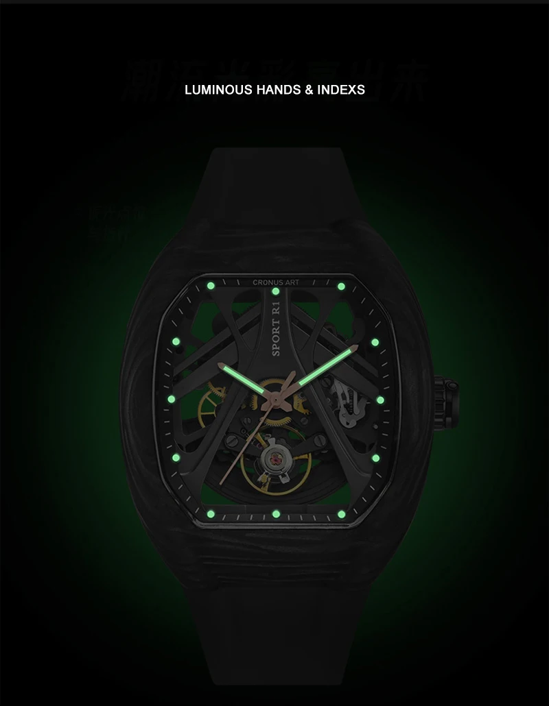 CRONUSART Men Automatic Watch 49MM Mechanical Wristwatch Luminous Carbon Fiber Tonneau Case SkeletonDial