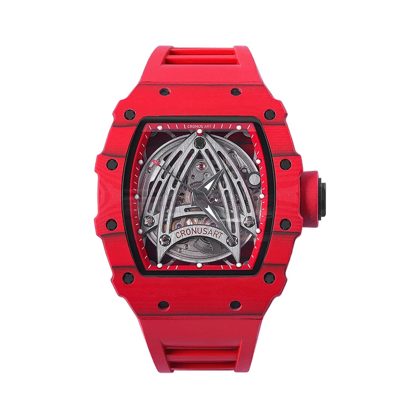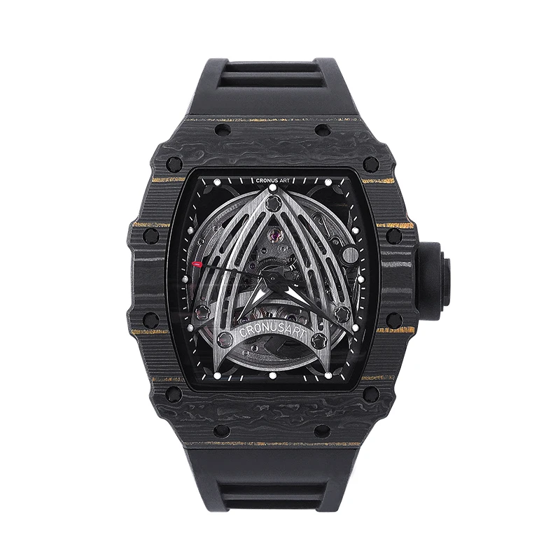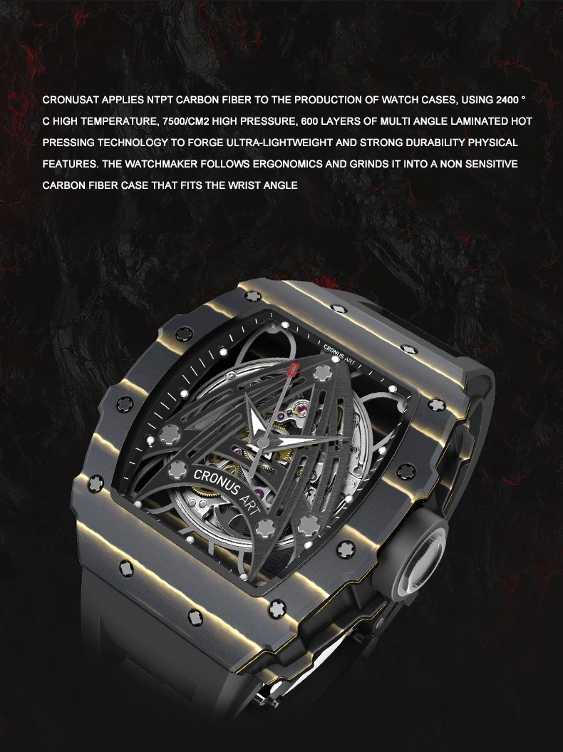 CRONUSART Men Automatic Watch 50mm*44mm Tonneau Mechanical Wristwatch Carbon Fibre Case Luminous Fluororubber Strap Skeleton
