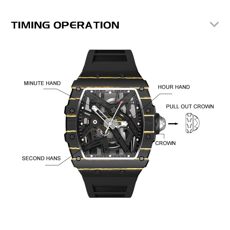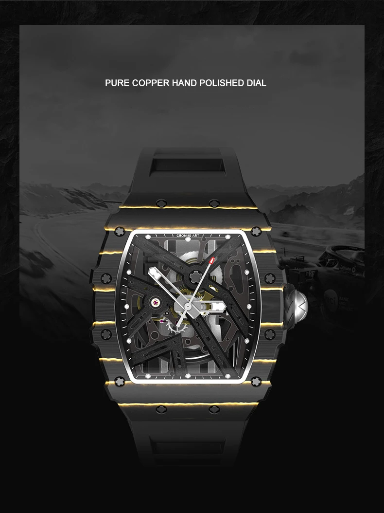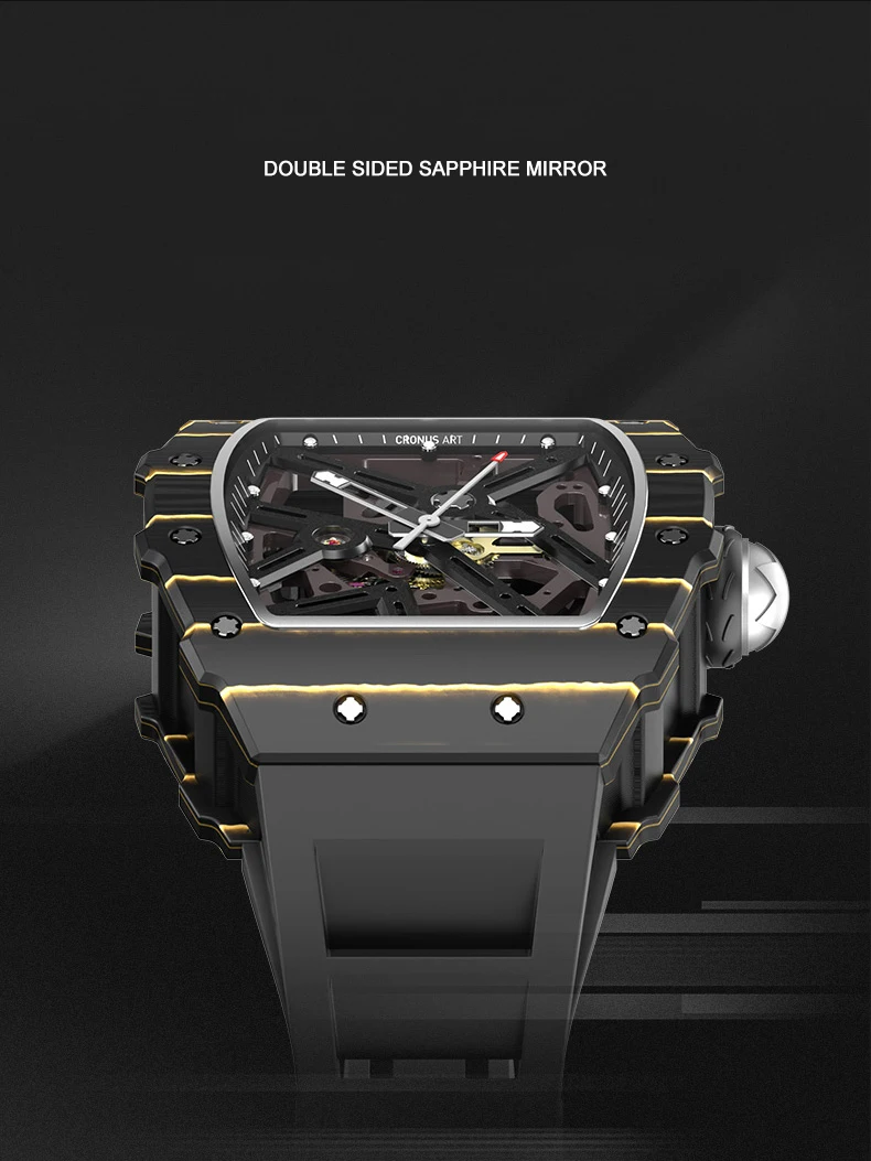 CRONUSART Men Automatic Watch Tonneau Carbon Fibre Case Mechanical Wristwatch Luminous Fluororubber Strap Skeleton Dial