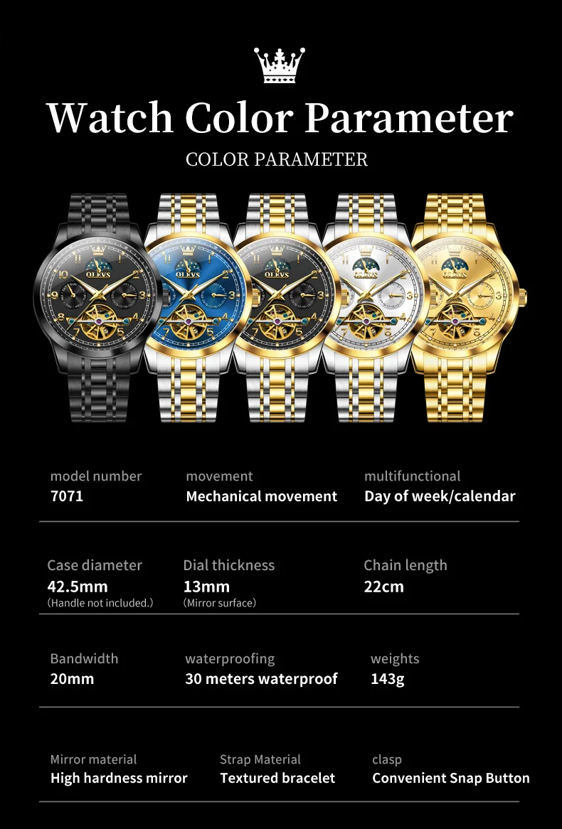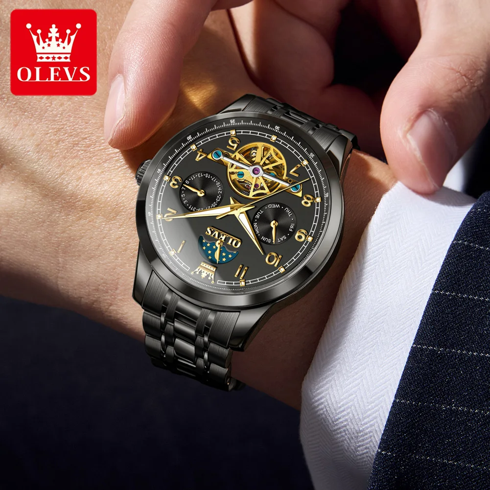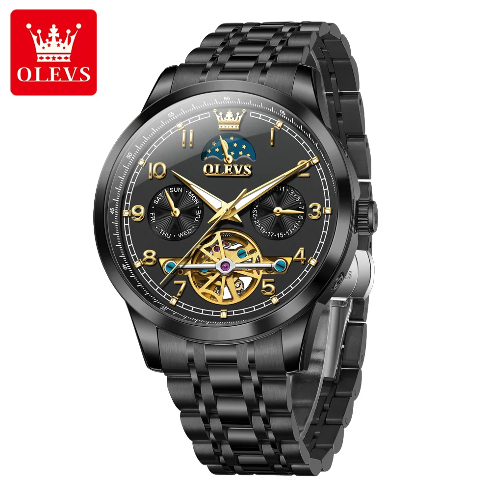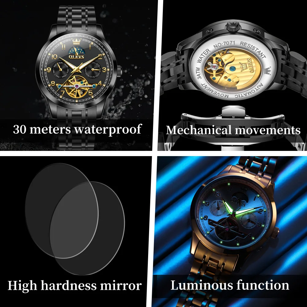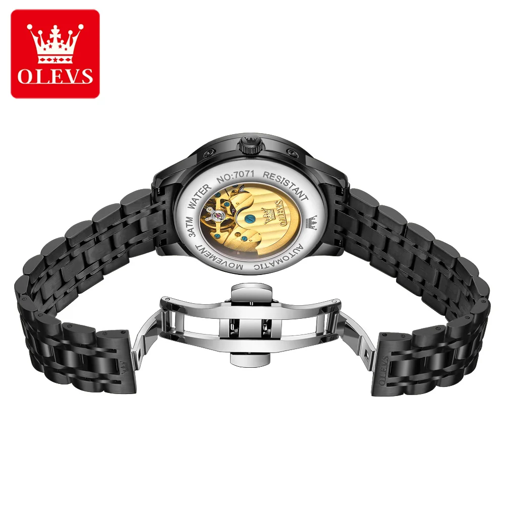 OLEVS Watch Men 7071 Original Skeleton Flywheel Automatic Mechanical Wrist Watches for Man Moon Phase Calendar Luxury Man Watch