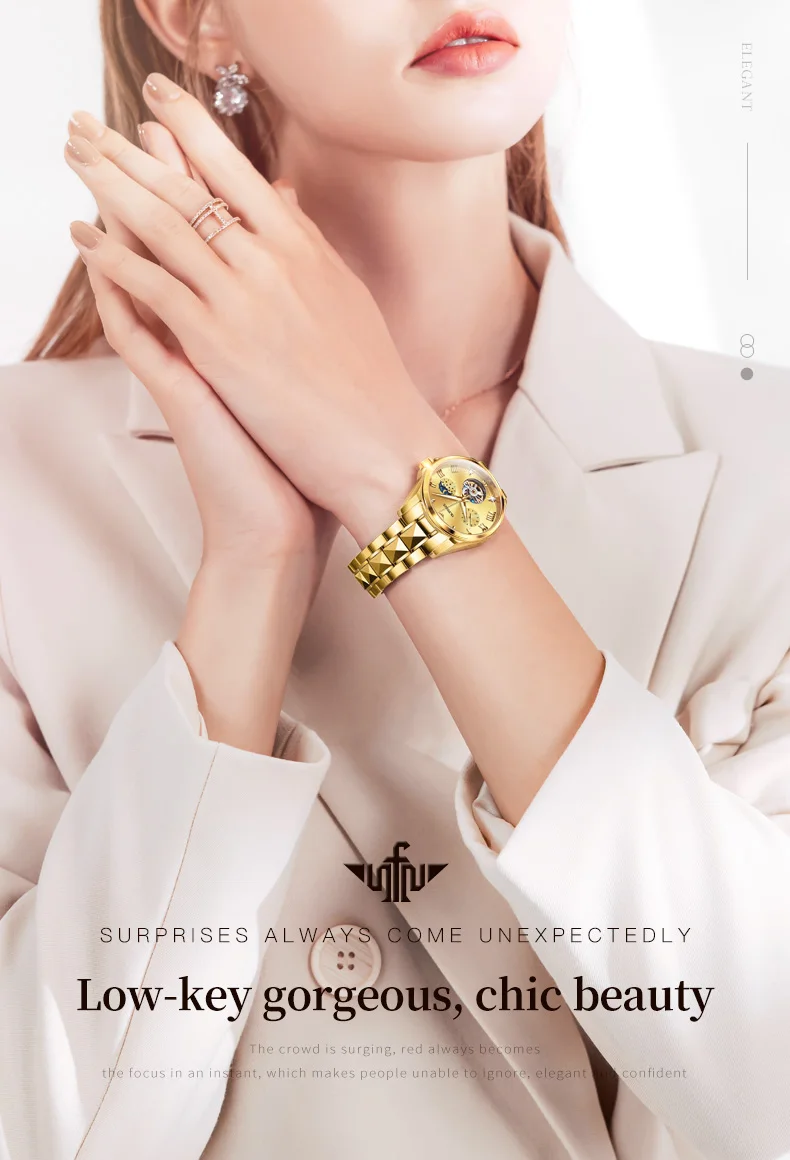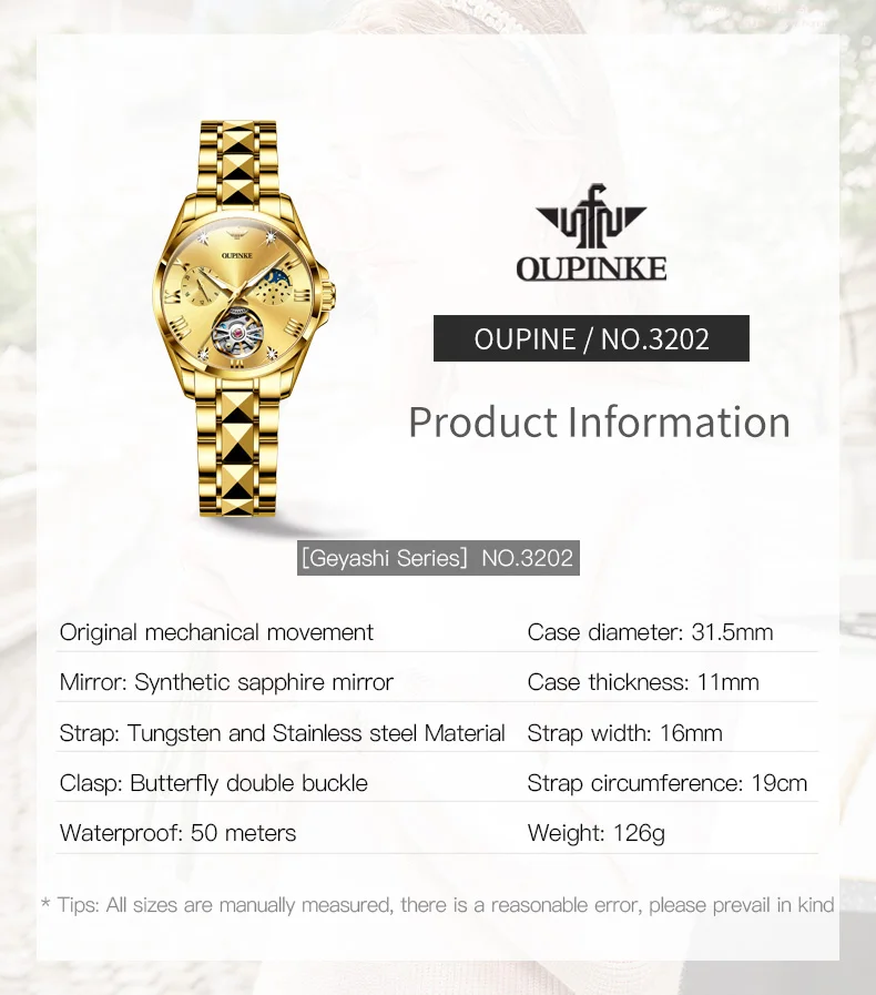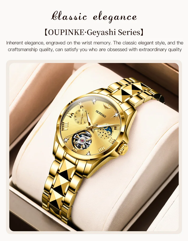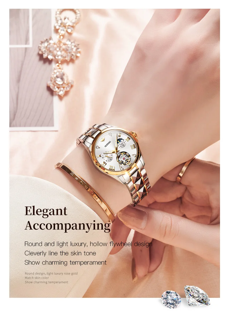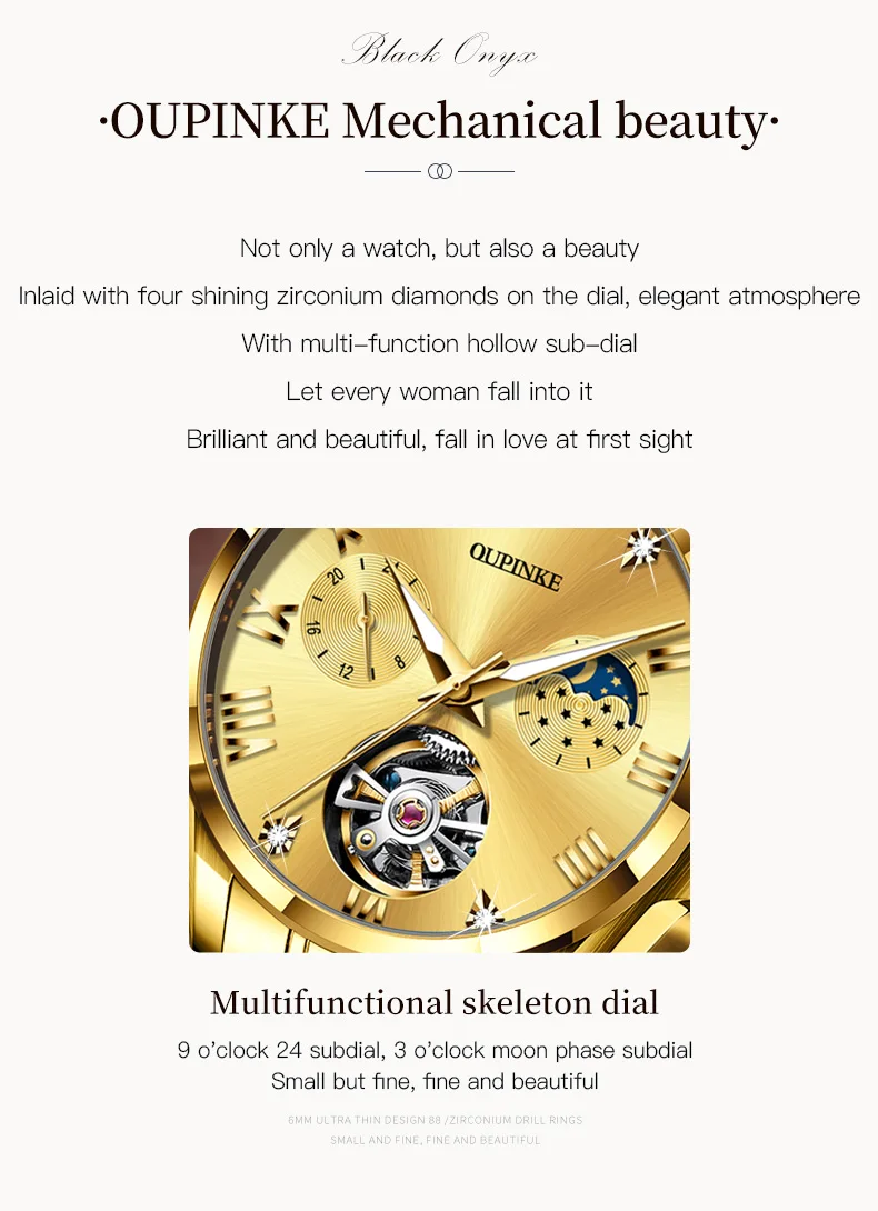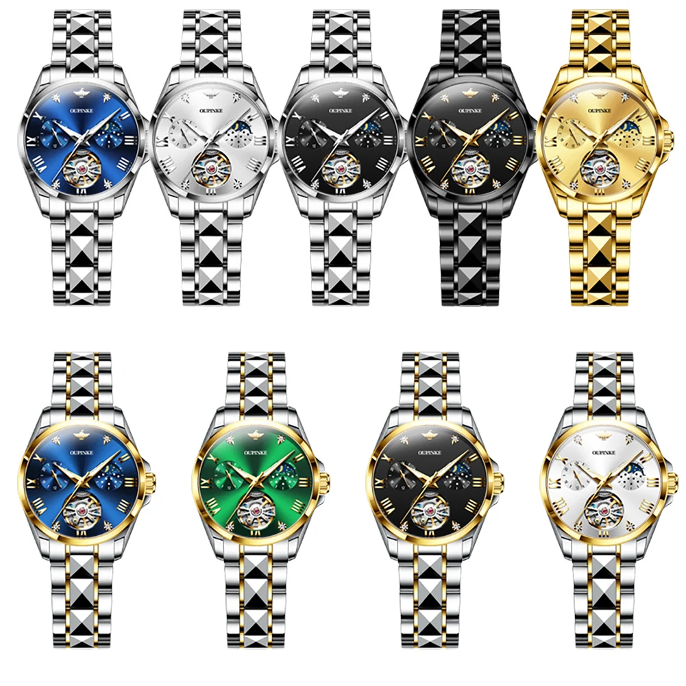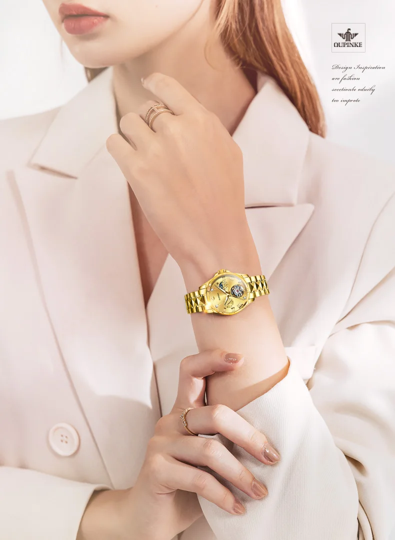 OUPINKE 3202 Waterproof Woman Watch Moon Phase Chronograph Original Skeleton Flywheel Automatic Mechanical Wristwatch for Women