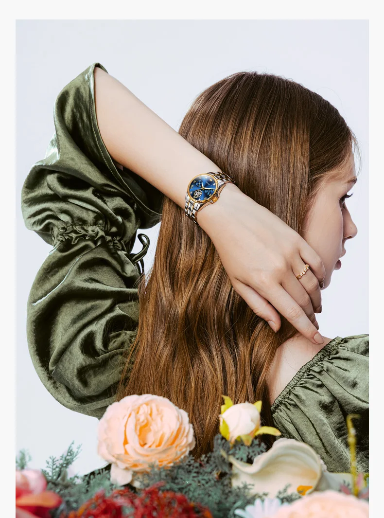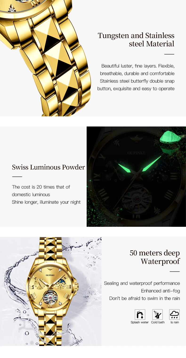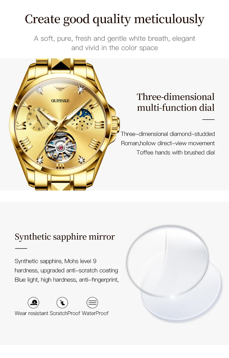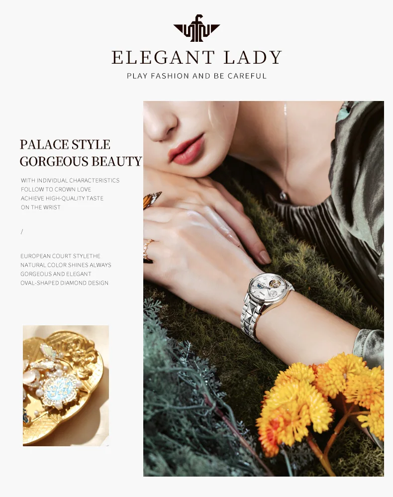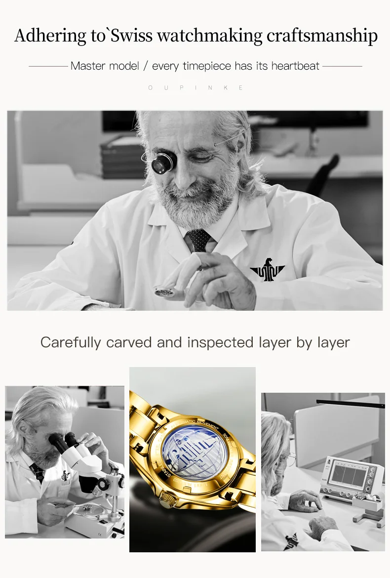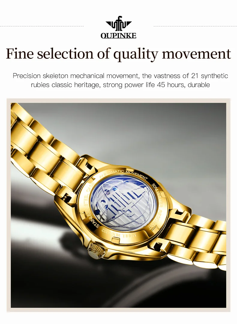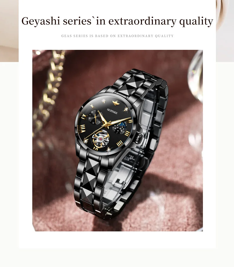 OUPINKE 3202 Waterproof Woman Watch Moon Phase Chronograph Original Skeleton Flywheel Automatic Mechanical Wristwatch for Women