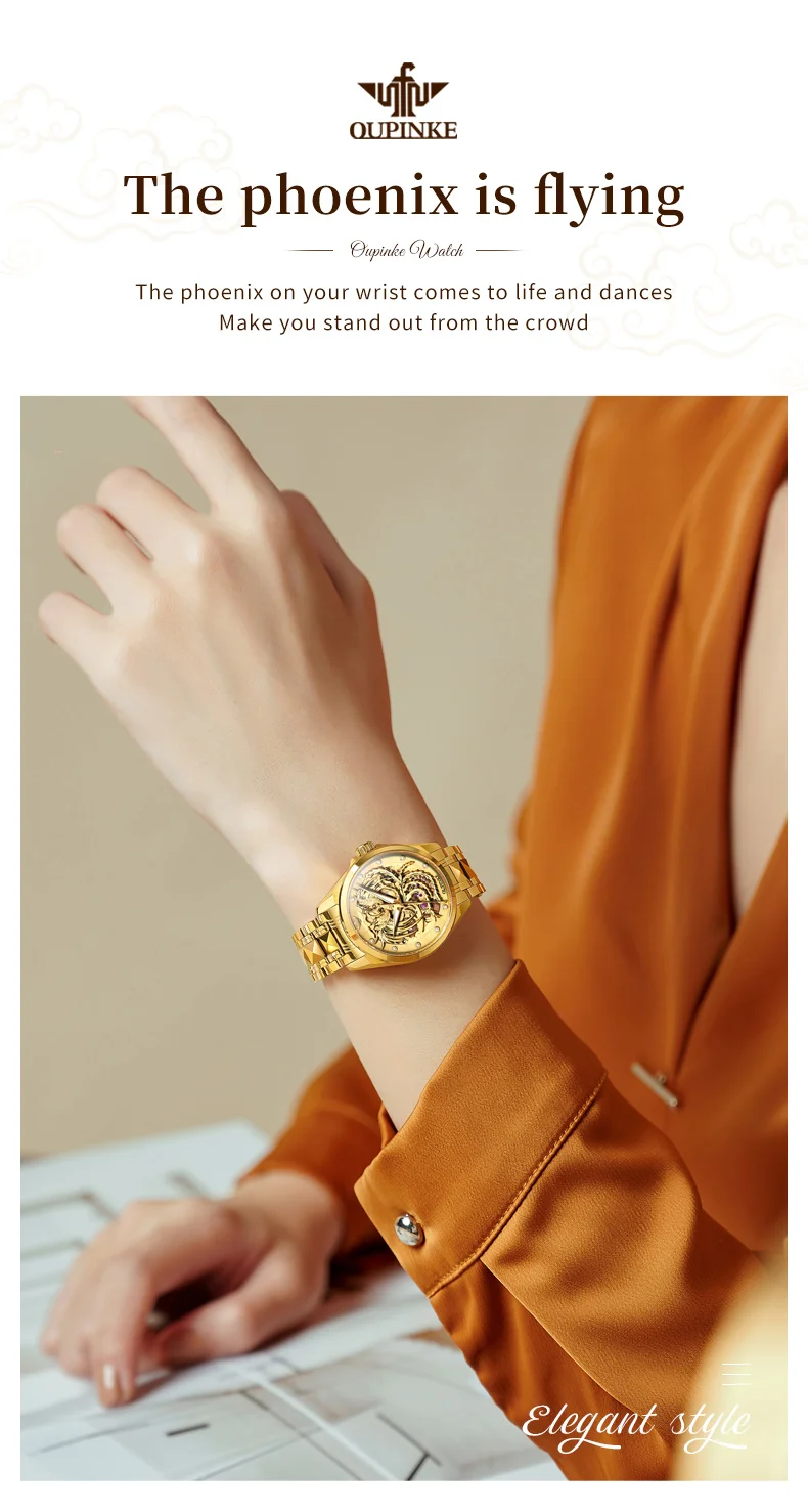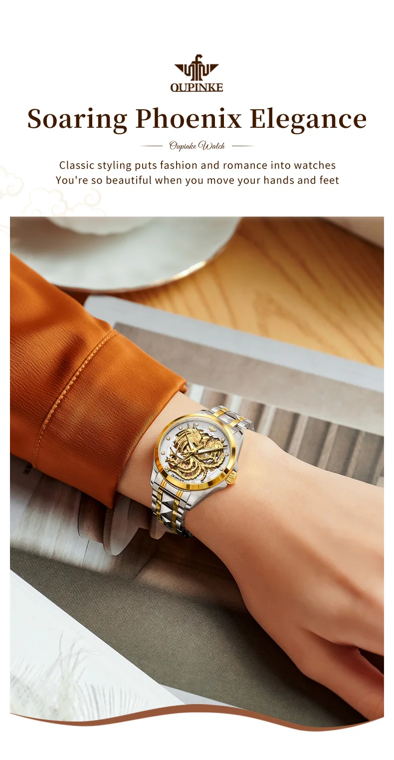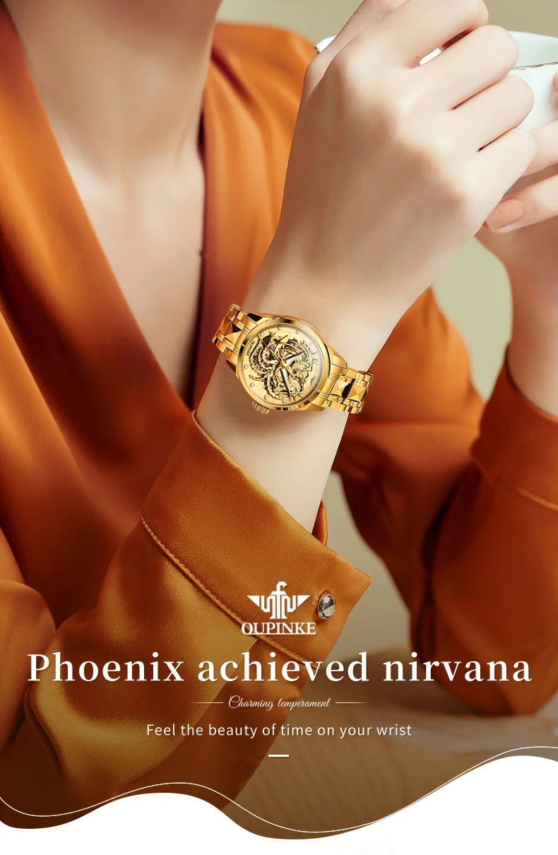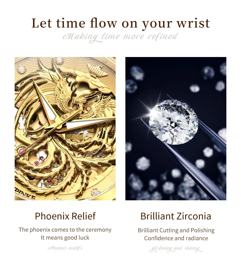 Phoenix watch: The three-dimensional phoenix shaped relief craftsmanship embodies the perfect combination of modern art and technology. The long French crystal endows the watch with ultimate luxury.