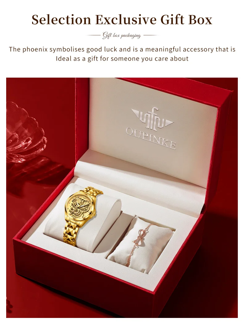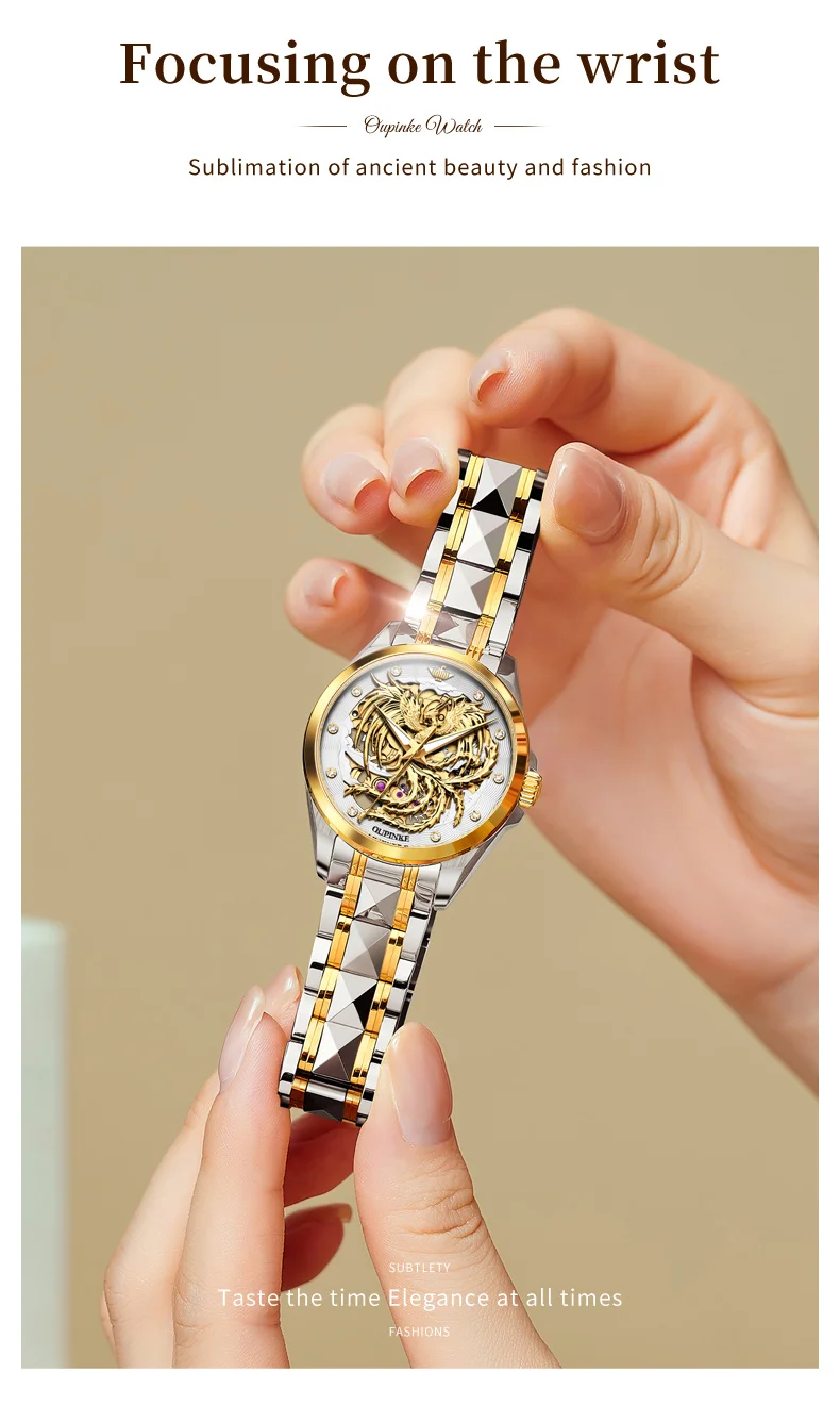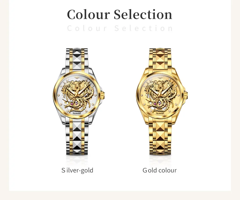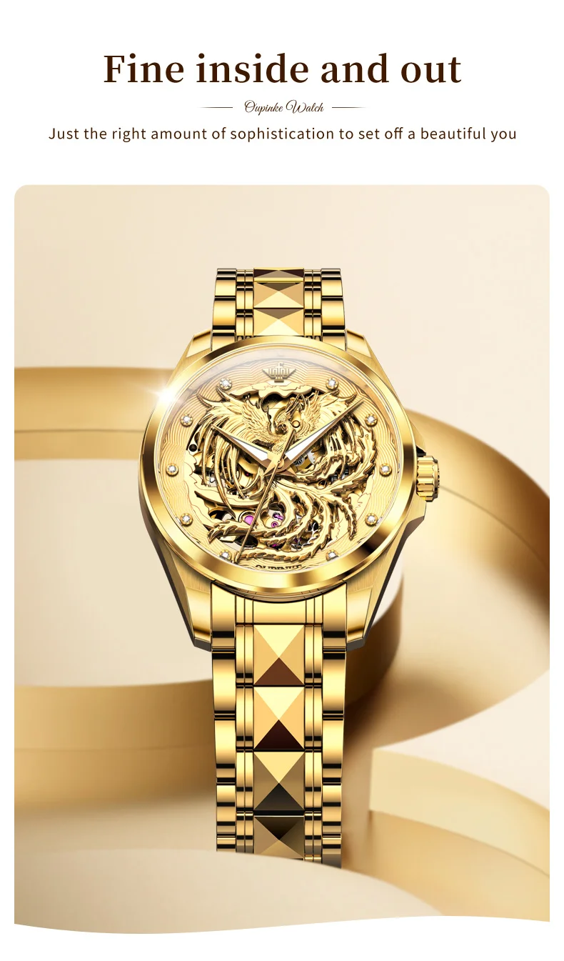 Phoenix watch: The three-dimensional phoenix shaped relief craftsmanship embodies the perfect combination of modern art and technology. The long French crystal endows the watch with ultimate luxury.